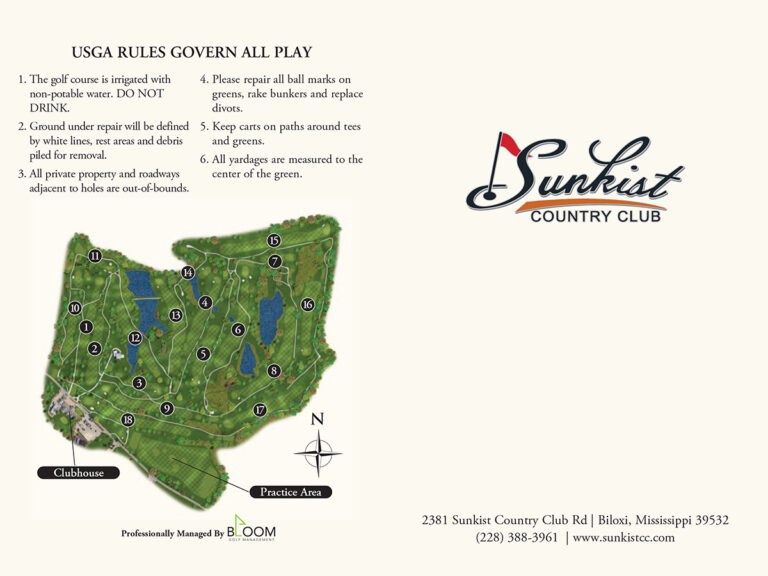 Sunkist Country Club: 4 Round of Golf on Monday-Friday, any time after 12PM. Please Call 228-388-3961 to book. *Expires 9/13/2026*. Sunkist Country Club is a premier golf destination located in Biloxi, Mississippi. The club features a championship 18-hole course designed by Roland Robertson, which opened in 1955. The course measures 6,285 yards from the longest tees and is known for its challenging yet enjoyable layout. It offers a variety of tee sets to accommodate different skill levels and includes water and sand on 13 holes. The club is a semi-private membership club, providing a serene and inviting atmosphere for golfers of all ages and skill levels.