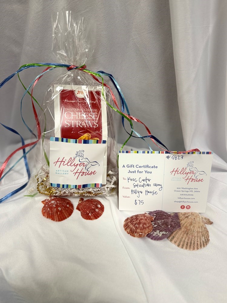 Hillyer House: $75 Gift Card & A Box of Cheese Straws Hillyer House is a nationally recognized award‑winning art and craft gallery located in the heart of historic downtown Ocean Springs, Mississippi. Established in 1970 by the Hillyer‑Reed family and now owned by third‑generation family member Paige Riley, it has been serving the Mississippi Gulf Coast for over 50 years.